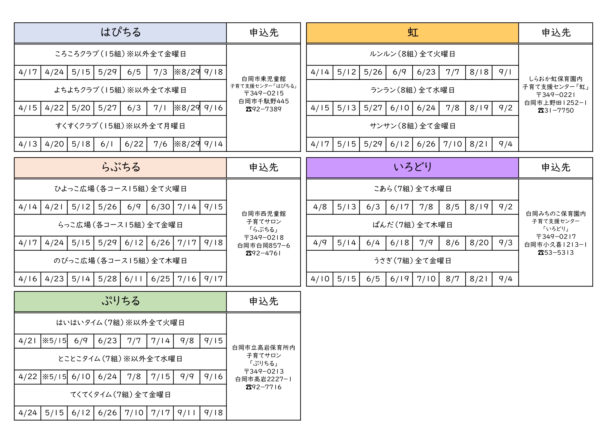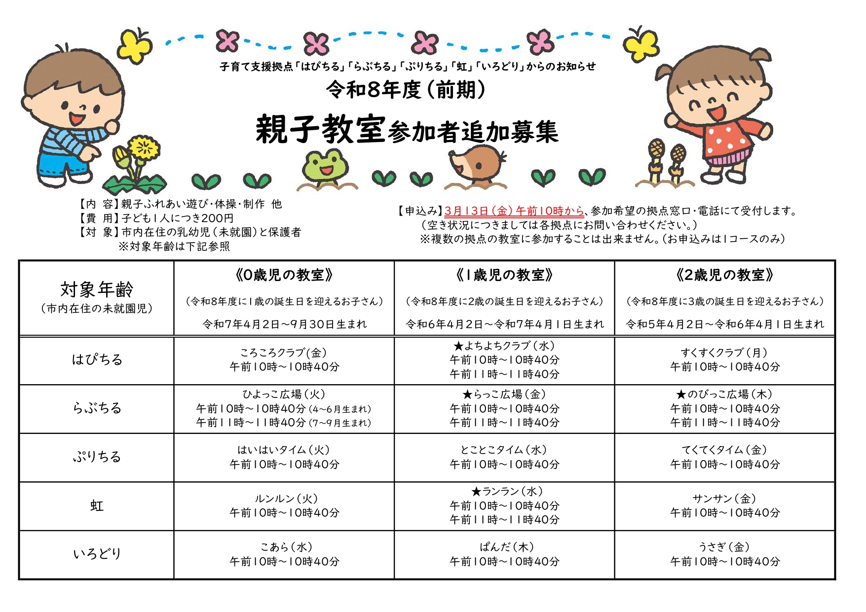 令和8年度 親子教室【前期】 令和8年度 【前期】親子教室の申込み 3月13日(金)より追加募集が始まります。 制作や身体を動かしながらみんなで楽しく遊びましょう! 😊窓口・電話にて受付します! (空き状況につきましては各拠点にお問い合わせください。)